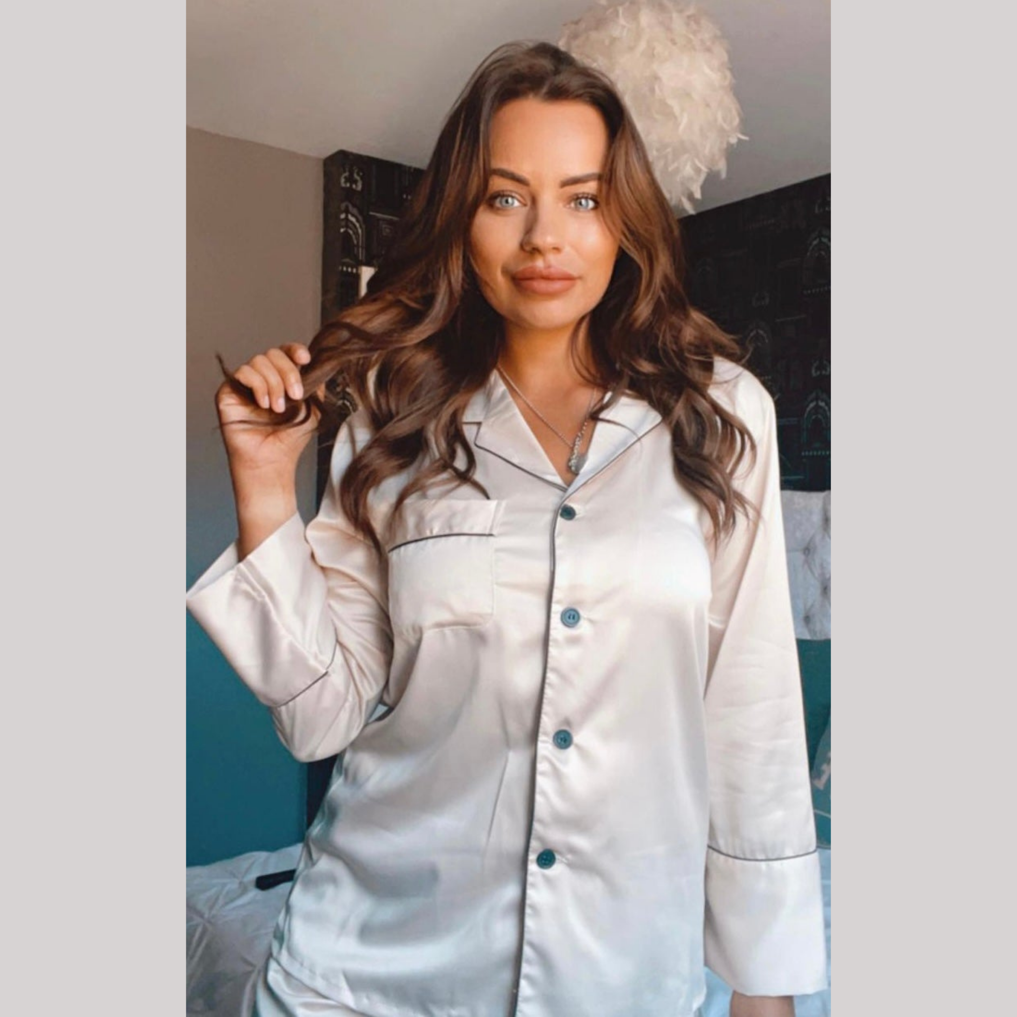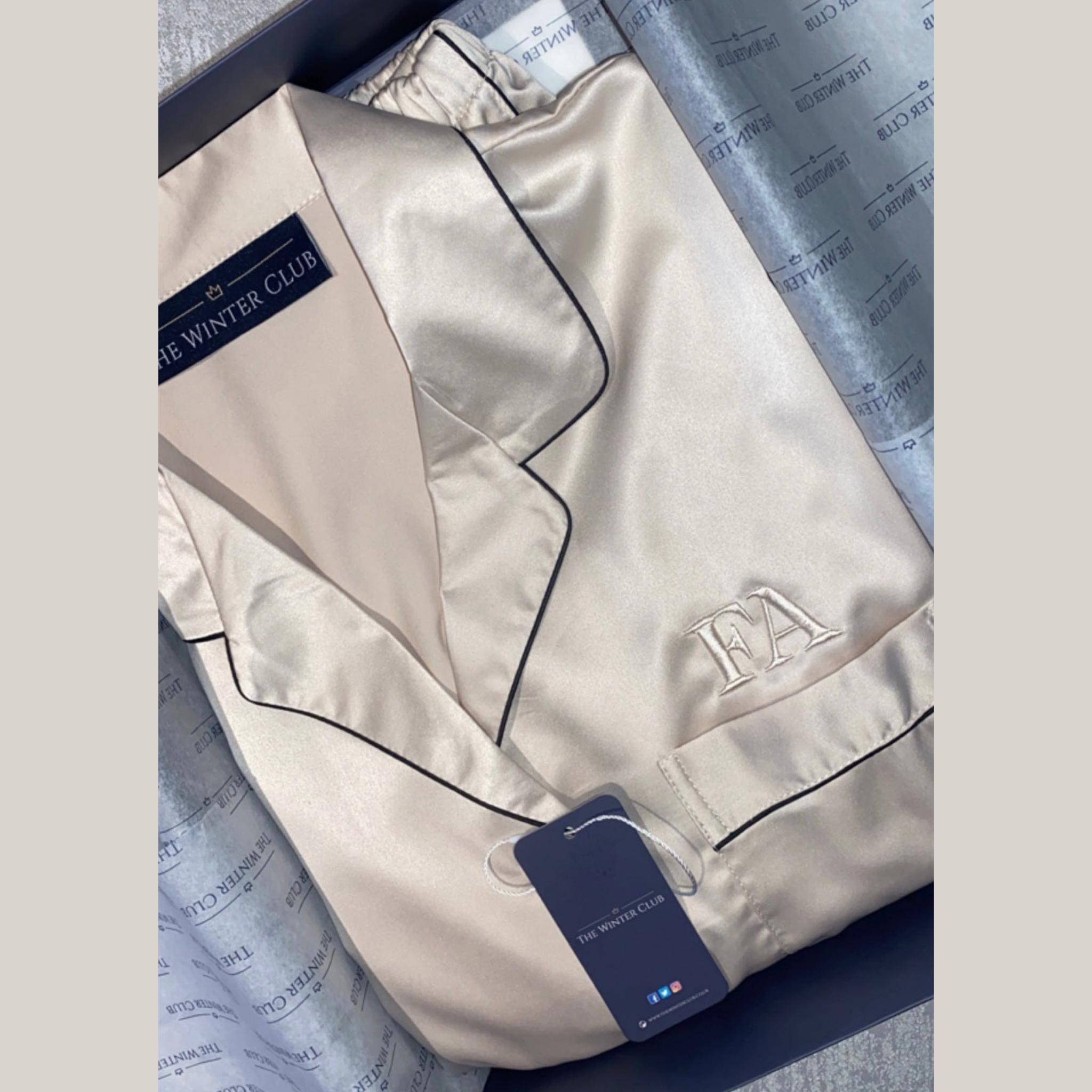 Prepare yourself for a luxurious night of sleep with the Winter Club’s champagne long sleeve satin pyjamas. Long silky pants and a matching long-sleeve top, is everything you need for a perfect bedtime routine. This cream set also offers a special touch with the option to add embroidery above the chest pocket. Choose from initials or a name in a champagne colour to match your PJ set.