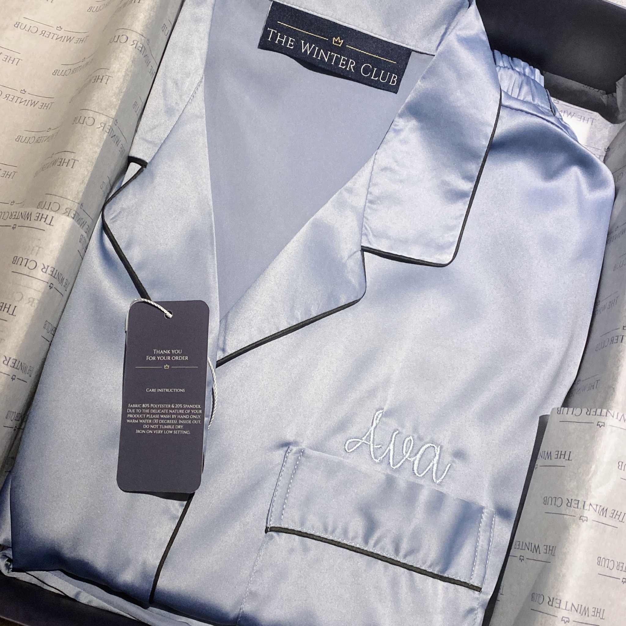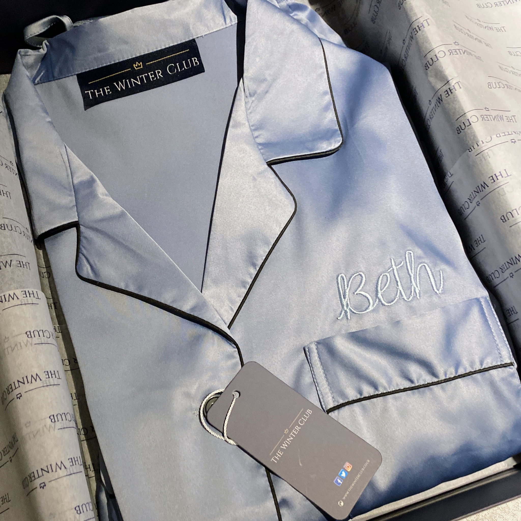 The Winter Club Sky Blue Satin Short Pjs are the perfect way to start your evening. This long-sleeved shirt and shorts combo is a great way to add comfort and luxury to your evening. This pyjama set makes the perfect gift, with an option for added embroidery above the chest pocket.
